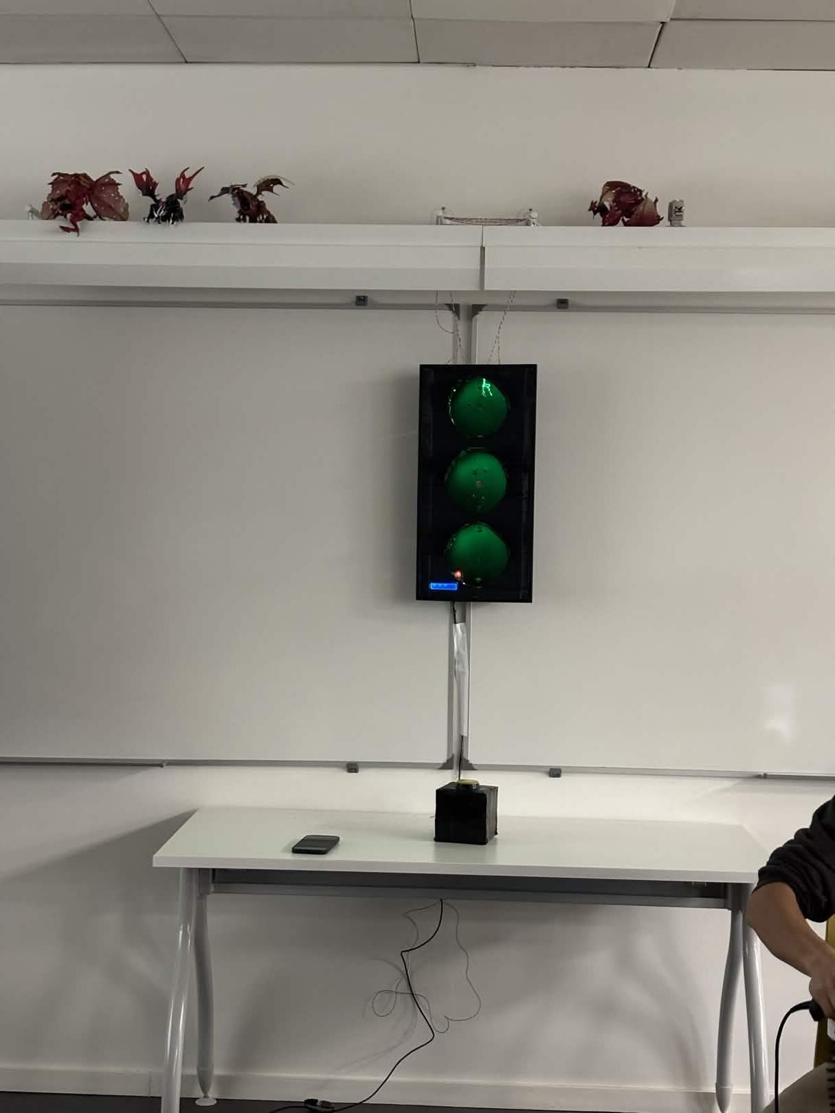 If the time between the red and green lights is less than 3 seconds, the lights change to a rainbow effect. Following this, the game automatically resets to its initial state, and players return to their original positions.